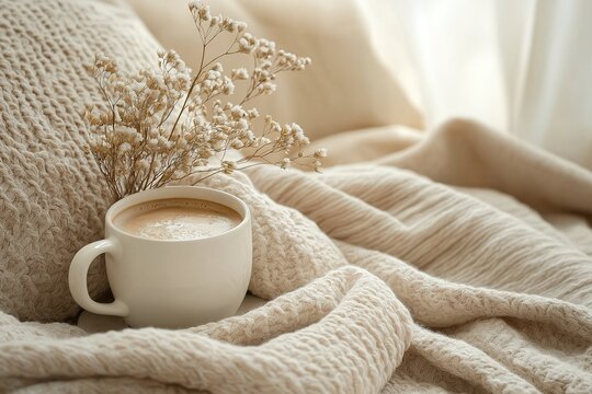 Experience calm and cozy moments with mocha mousse coffee on a soft blanket