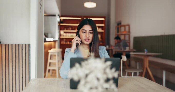 Phone call, laptop and woman in cafe for freelance feedback, news or discussion. Mobile, talk and journalist with computer for remote work, story source and fact check information in coffee shop