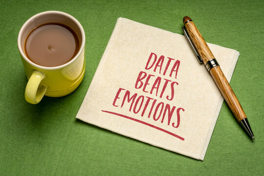 data beats emotion reminder, handwriting on a napkin with a cup of coffee, facts, research, science and analytics concept