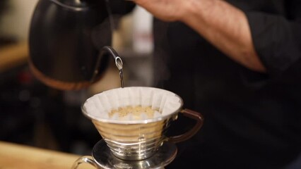 barista pour hot water to wet paper filter on dripper, coffee brewing process