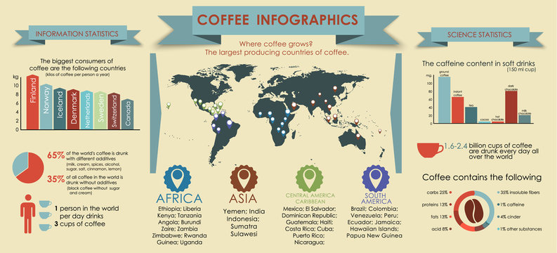 Coffee infographic. Processes stages of coffee production press machine grains espresso drink cups vector template. Illustration of cup coffee drink, espresso infographic, beverage with caffeine