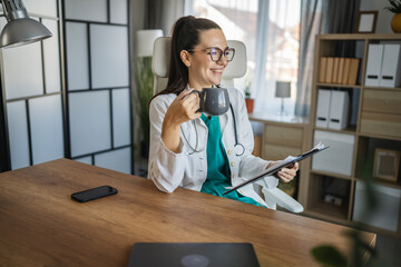 Closeup image of a woman holding and reading a vintage novel book while drinking coffee