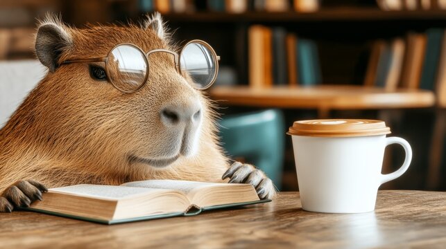 A capybara with glasses is enjoying a book beside a steaming cup of coffee in a warm cafe atmosphere