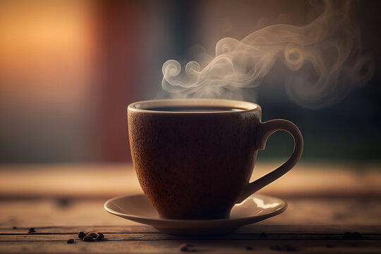 cup of coffee with smoke. Steaming hot coffee on a table: Enjoy the rich aroma and warmth of freshly brewed coffee. Perfect for coffee lovers, bloggers, and foodies.