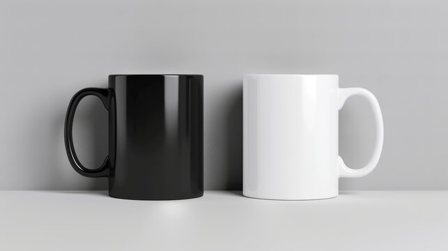 Two classic black and white coffee mugs sitting side by side, perfect for coffee lovers or coffee-themed designs, isolated on grey background