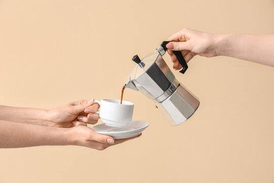 Woman pouring espresso from geyser coffee maker into cup on beige background