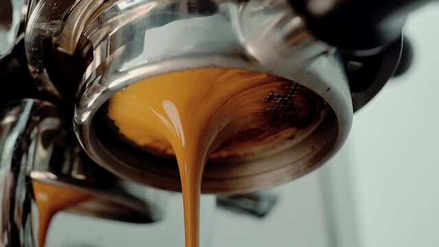 4K Pouring coffee stream from professional machine in cup. Barista man making double espresso, using filter holder. Flowing fresh ground coffee. Drinking roasted black coffee in the morning.