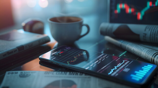 Cup filled with coffee beans placed on printed market charts showing rising global coffee prices. Concept of coffee trade, business growth, and global market trends.