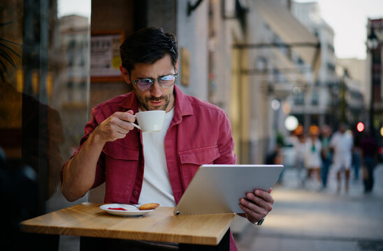 Businessman analyzing financial technology data for investment integration using laptop in modern office, visualizing digital charts, market trends, and fintech insights for economic strategy.