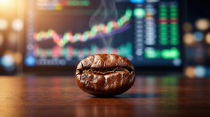 Steaming coffee bean on a table, with glowing financial charts in the blurred background, symbolizing commodity market trends and trading.