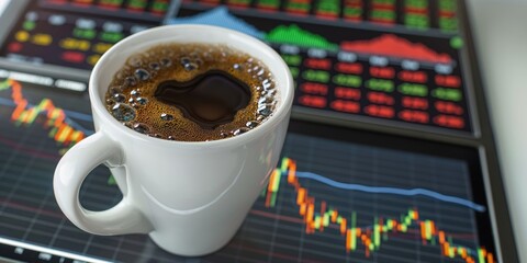 Caffeinated with a delicious cup of coffee technology business background with laptop showing stock market trends