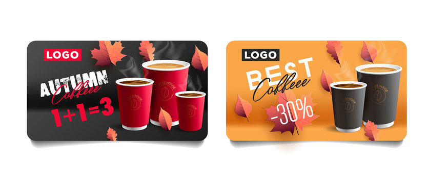 Set of promo discount cards with autumn leaves illustrations and coffe paper cups, offer of discount or 1 plus one equals 3, voucher template