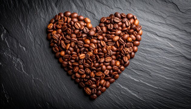 コーヒー豆をハート型に並べ、マットなスレート背景でクローズアップ撮影しました。