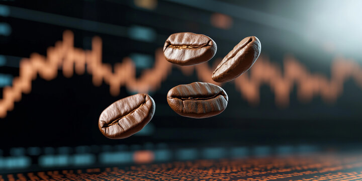Coffee beans floating over rising stock market graph indicating increasing coffee prices