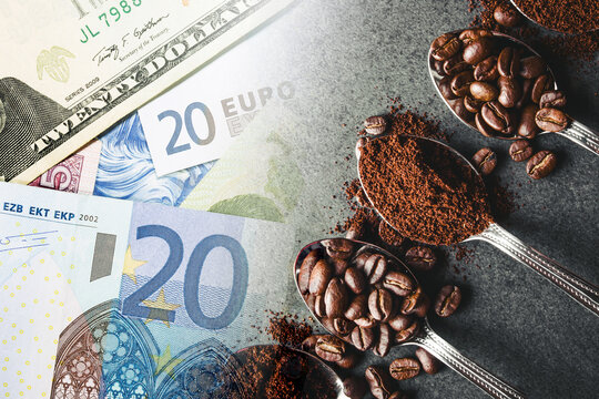 Coffee prices texture. Price of beans. Coffee seeds export. Money banknotes. Euro and dollar currency. Black morning coffee beans. Cash payment. Coffee industry background. Cost of roasted seeds.
