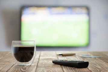 Freelancer drinking coffee at the office and typing at computer in special program. Entrepreneur working in modern professional workspace workplace in corporate company with wireless computer keyboard