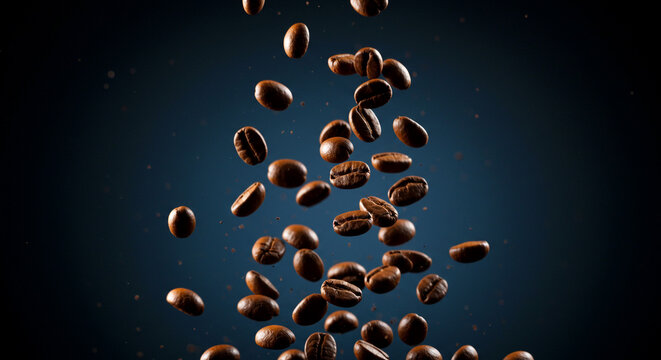 Fresh roasted coffee beans dynamically falling against rich blue backdrop for coffee shop promotions