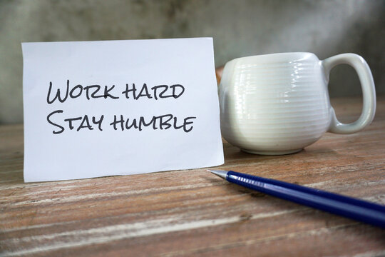 Business motivational quotes - Work hard, stay humble. Text messages on a white paper with cup of coffee or tea and a pen on the wooden table. Positive slogan motivation concept.