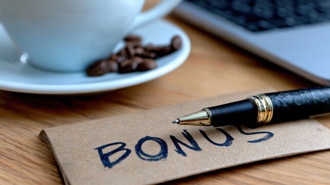 Writing on a note saying bonus next to a cup of coffee and a laptop