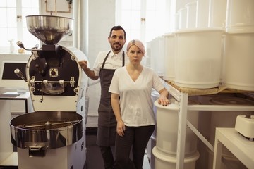 slow motion raw Arabica coffee beans falling into the roaster machine