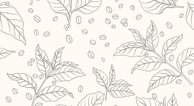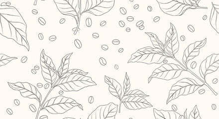 Elegant seamless pattern of coffee plant with leaves and beans on a cream background.