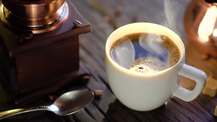 Coffee cup with freshly brewed coffee on an old vintage table. Steam rises from the cup.