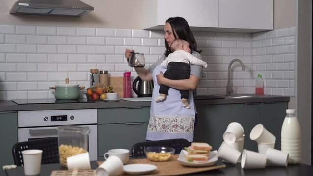 Young woman pouring coffee into cup while putting on shoes at home in morning