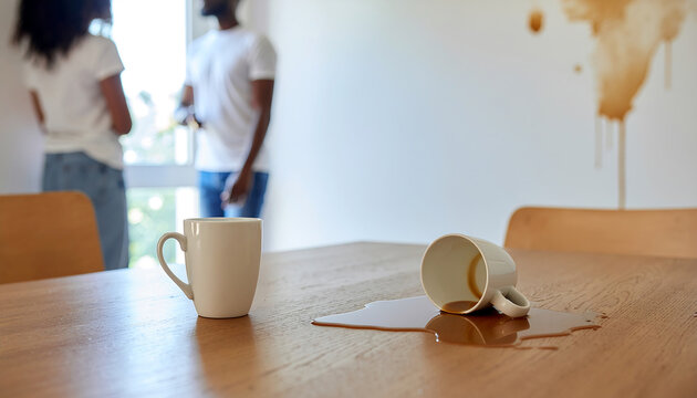 Spilled coffee from a tipped-over mug on a wooden table with a couple in a tense discussion in the background.