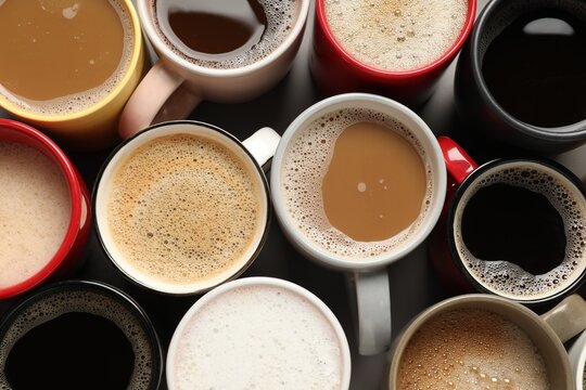Assorted coffee cups with latte art hot drinks on dark table multiple varieties