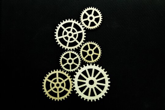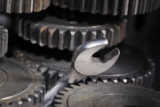Close up of interlocking metal gears in a mechanical system against a dark background
