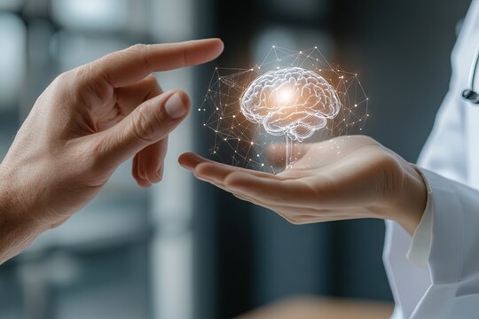 Hands reaching towards a glowing brain symbolizing knowledge and innovation in healthcare