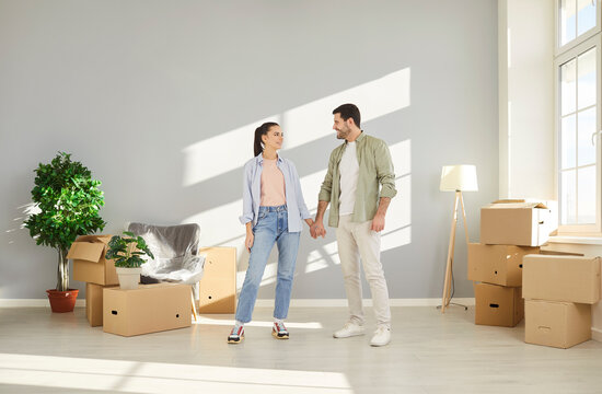 Happy couple, young family celebrate relocation standing in new modern apartment, husband, wife feels happy, start living together, enjoy moving day to new flat, starting cohabitation after marriage