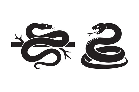 Set of four black snake silhouettes showing different coiled and slithering poses for design projects