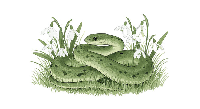 A beautifully detailed illustration of a green snake coiled peacefully in the grass among delicate white snowdrop flowers.
