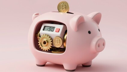 Pink piggy bank with visible clockwork mechanism and Bitcoin coin insertion