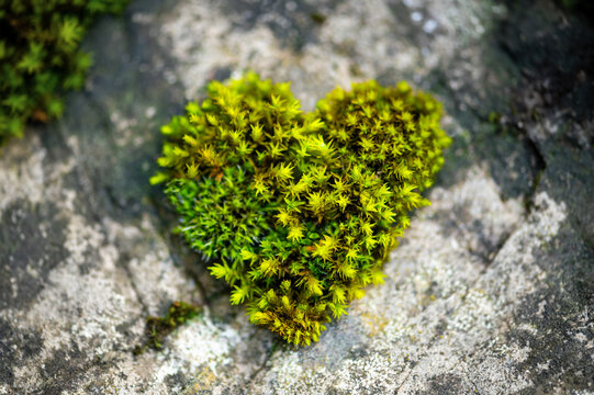 Moss heart on rocky ground. Random fresh green love symbol formed by coincidence from fine little plants of moss on a day in late summer. Macro close up with delicate wet structures in warm sunlight.