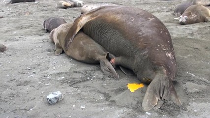 Copulation of seals for procreation and newborn calves in Antarctica. Fascinating journey and ecotourism in unique places. Coast of cold ocean on background of snowy mountains. Wild nature.