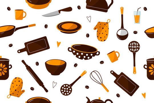 Fun and colorful doodle seamless pattern of kitchenware and cooking utensils on a white background, utensils, spatula