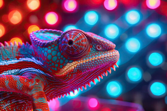 Close up view of a vibrant chameleon with its colorful skin, displayed for observation
