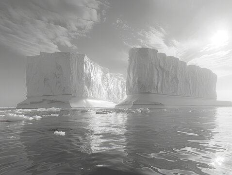 Majestic icebergs rise from the ocean during dawn. Antarctica, cold climate, natural beauty.