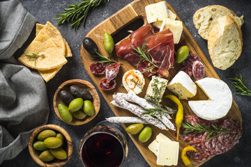 Antipasto board with sliced meat, ham, salami, cheese, olives an
