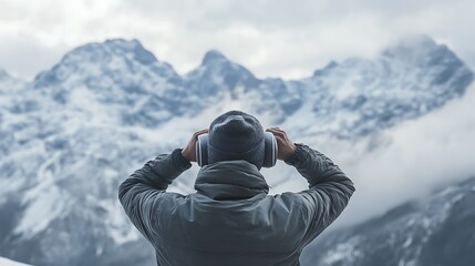 A man adjusting his warm, fleece-lined ear warmers while standing in front of a mountain backdrop covered in snow