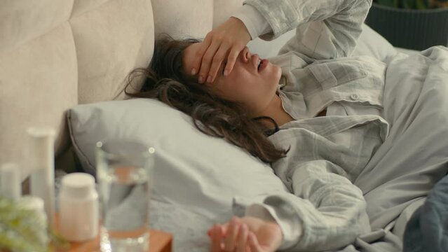 Sick woman lying on bed bedroom home headache illness cough unhealthy epidemic female fever flu girl disease medicine temperature symptom unwell virus unhappy cold tired patient pill drug treatment
