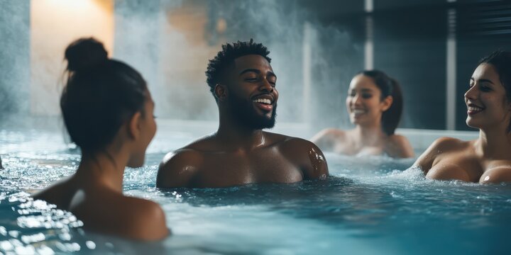 Diverse group enjoying contrast therapy with a cold plunge and sauna in a modern wellness facility.