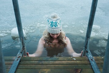Girl or woman ice bathing in the cold water among ice cubes with the teacher or trainer. Wim Hof Method, cold therapy, breathing techniques, yoga and meditation