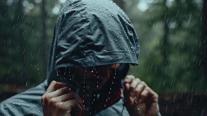Man hiker hiking in mountain forest wearing cold weather accessories, wind jacket and backpack for camping outdoor. Guy portrait lifestyle