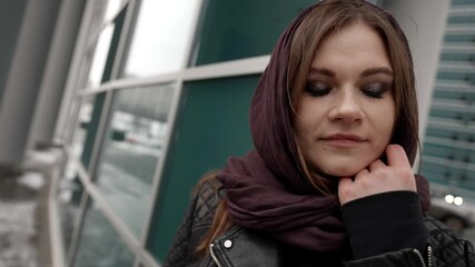 Portrait of a gloomy woman on the street coldly covers her head with a handkerchief