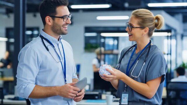 A collaborative scene of two healthcare professionals discussing in a modern office environment, showcasing teamwork and innovation