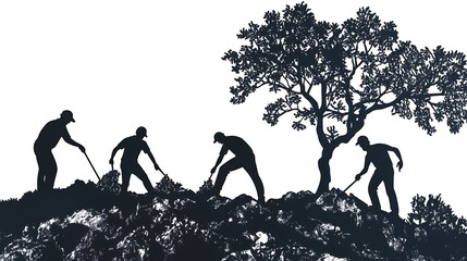 reforestation efforts in action, silhouettes planting trees, collaborative effort, clean white
