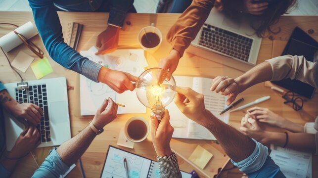 A group of diverse professionals brainstorm ideas in a collaborative and creative work environment. AIG535